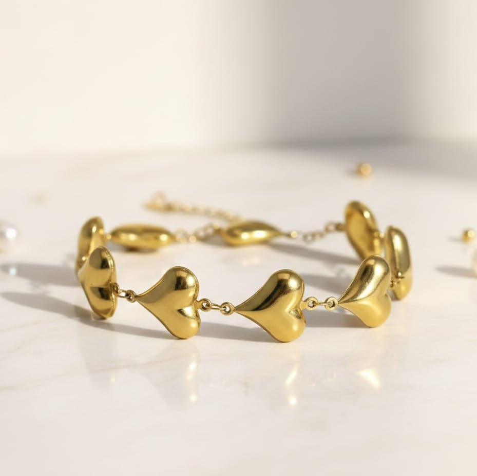 This delicate gold-tone bracelet features a chain of smooth heart charms linked beautifully together. The polished finish gives it a soft shine, making it perfect for adding a romantic touch to your everyday look.