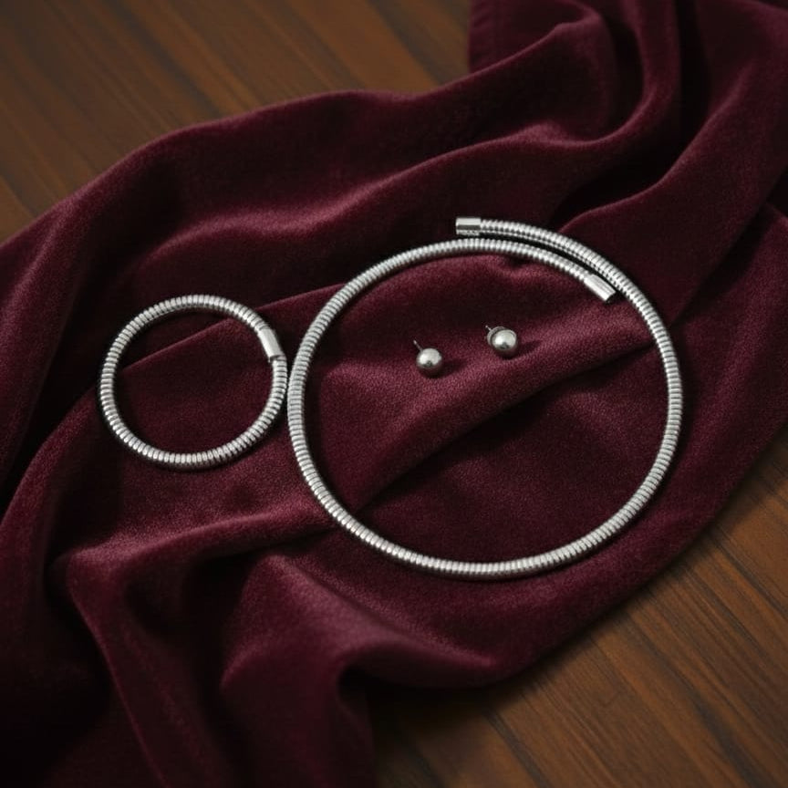 Understated, powerful, and effortlessly refined — this sleek silver jewellery set is the definition of modern minimalism. Featuring a textured collar necklace, matching bracelet, and classic stud earrings, the clean design speaks volumes without saying too much.
